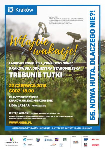Tegoroczne wakacje rozpoczną się w Nowej Hucie mocnym muzycznym akcentem - koncertem plenerowym z cyklu Nowa Huta. Dlaczego Nie?!, w którym udział wezmą: laureaci Konkursu Piosenki Żonkilowy Song, Krakowska Orkiestra Staromiejska oraz zespół TREBUNIE TUTKI. Koncert odbędzie się na scenie plenerowej na Plantach Bieńczyckich (os. Kazimierzowskie) w dniu zakończenia roku szkolnego - 22 czerwca 2018 r. Początek o godz. 18.00.