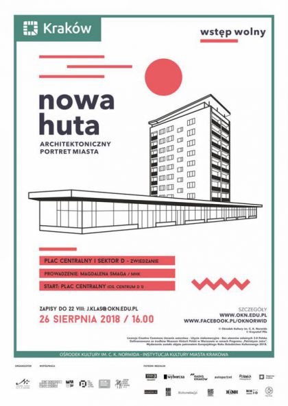 Zwiedzanie Placu Centralnego i osiedli tzw. sektora D w ramach projektu Nowa Huta – architektoniczny portret miasta. Prowadzenie: Magdalena Smaga (MHK). Zapisy do 22 VIII. Wstęp wolny.