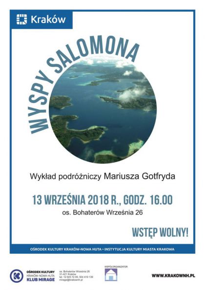 Klub Mirage Ośrodka Kultury Kraków-Nowa Huta (os. Bohaterów Września 26) zaprasza 13 września o godz. 16.00 na wykład podróżniczy o Wyspach Salomona. Docierają tam tylko nieliczni z bardzo prostego powodu – są one praktycznie na końcu świata. I właśnie z tego powodu są tak interesujące. Podczas wykładu w Klubie Mirage Mariusz Gotfryd - podróżnik, geograf, pasjonat wypraw w nieznane opowie o kolejnej swojej podróży i będą to właśnie Wyspy Salomona - odległe, mało znane i tajemnicze wyspiarskie państwo na Pacyfiku.