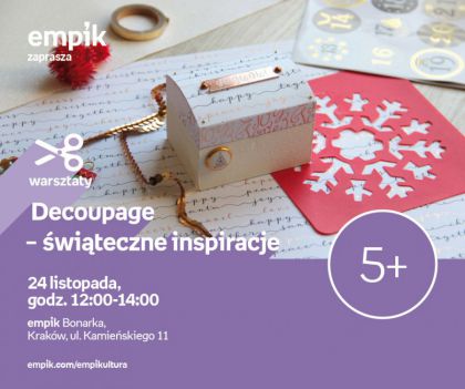 Decoupage to doskonała technika do tworzenia świątecznych ozdób i zimowych dekoracji. W trakcie naszych listopadowych warsztatów wyjaśnimy tajemniczo brzmiące techniczne określenia, związane z tą formą dekorowania przedmiotów, m.in. „decoupage serwetkowy”, „jednoskładnikowe spękania”, „szablony” czy „transfer-foto”. Każdy uczestnik zajęć będzie mógł przetestować poszczególne techniki w praktyce i wykonać własnoręcznie ozdoby do domu lub mały prezent dla bliskiej osoby. Do wspólnego tworzenia zapraszamy całe rodziny. Wiek: 5+. Zapisy pod nr tel.: 603 114 165.