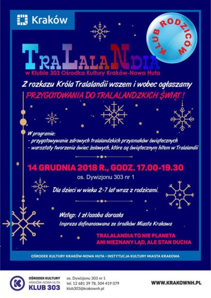 Klub 303 Ośrodka Kultury Kraków-Nowa Huta (os. Dywizjonu 303 nr 1) zaprasza 14 grudnia w godz. 17.00-19.30 na ostatnie już spotkanie z Tralalandią. Jego tematem będą tralalandzkie święta. Uczestnicy dowiedzą się czy w Tralalandii obchodzi się święta, jak one wyglądają, czy rodowity Tralalandczyk ubiera choinkę i czeka na Mikołaja? Bo kto wie - może w Tralalandii ubiera się drzewka figowe, a prezenty rozdaje Tralalandzki Paw co musi wypić sto kaw? A w programie między innymi warsztaty przygotowania zdrowych przekąsek świątecznych według tajnego przepisu królewskiego kucharza oraz wykonywania świec żelowych, które podobno są hitem w tralalandzkim okresie świątecznym.