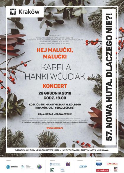Organizatorzy 57. edycji projektu Nowa Huta. Dlaczego Nie?! zapraszają krakowian i ich gości, którzy w tym wyjątkowym, świątecznym czasie zawitają pod Wawel, na spotkanie z kolędami na góralską nutę (ale nie tylko!), w wykonaniu Kapeli Hanki Wójciak. Koncert Hej Malućki, Malućki odbędzie się 28 grudnia 2018 r. o godzinie 19.00 w kościele pw. Maksymiliana Marii Kolbego (os. Tysiąclecia 86, Kraków). W programie koncertu znajdą się przede wszystkim tradycyjne kolędy i pastorałki, ale nie zabraknie utworów współczesnych, śpiewanych do słów księdza Jana Twardowskiego, Henryka Rostworowskiego, Beaty Skulskiej-Papp, a także autorskich dzieł Hanki Wójciak. Wydarzenie poprowadzi dyrektor artystyczna cyklu – Lidia Jazgar.