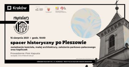 Podczas spaceru uczestnicy zwiedzą cmentarz, kościół małej architektury, założenia parkowo-pałacowe oraz kapliczki. Ponadto omówiony zostanie dawny układ urbanistyczny Pleszowa. Podczas spaceru usłyszymy także historię pobytu Tadeusza Kościuszki w Pleszowie w 1794 r. oraz przyjrzymy się lokalnym formom upamiętnienia tego wydarzenia.