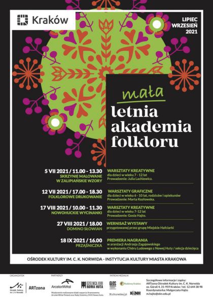 Szczegółowe informacje i zapisy: Małgorzata Hajto, koordynatorka Małej LETNIEJ AKADEMII FOLKLORU, tel. 12 644 38 98, m.hajto@okn.edu.pl.