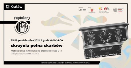 Mobilna lekcja historyczna dla przedszkoli i klas 0-III pt. „Skrzynia pełna skarbów”. W drewnianej, wielkiej skrzyni dzieci odnajdą 10 pięknie wykonanych w drewnie i malowanych figur, przedstawiających najważniejsze obiekty architektury sakralnej, dworkowej i pałacowej, symbole z legend, postaci z terenów ziem przednowohuckich, a także prawdziwy skarb! Poszukiwania będą powiązane z opowieścią edukatora o historii i dziedzictwie tych ziem sprzed 1949 roku. W drugiej części zajęć każdy uczestnik otrzyma także „Mały Raptularz” – kartę pracy do uzupełnienia podczas pracy warsztatowej. Lekcja prowadzona w formie zabawy i interakcji z dziećmi, uruchamiająca na inwencję twórczą i pobudzająca wyobraźnię.
