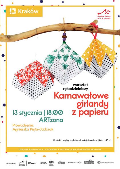 Spotkanie ,,Karnawałowe girlandy z papieru” będzie miało charakter warsztatu rękodzielniczego. Uczestnicy pod czujnym okiem prowadzącej wykonają obiekty przestrzenne z kolorowego papieru, które następnie można zawiesić jako dekorację. Zajęcia będą obejmowały podstawy papieroplastyki oraz origami, uczestnicy nabędą też takie umiejętności jak poprawne składanie i sklejanie modelu według określonego schematu.