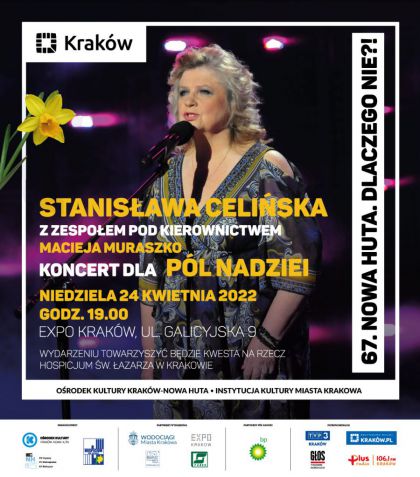 Wiosenne koncerty cyklu Nowa Huta. Dlaczego Nie?! poświęcone są zawsze Polom Nadziei – akcji zbierania funduszy na rzecz polskich hospicjów, która została zainicjowana w Polsce przez krakowskie Towarzystwo Przyjaciół Chorych, prowadzące w Nowej Hucie Hospicjum św. Łazarza. Podczas kwietniowego koncertu usłyszymy Stanisławę Celińską - wszechstronną aktorkę i utalentowaną wokalistkę wraz z zespołem pod kierownictwem Macieja Muraszko.