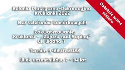 Informacje, karty zgłoszeń: https://www.mdk-dh.krakow.pl/obozy/1078-kolonia-plastyczno-rekreacyjna-kruklanki-2022