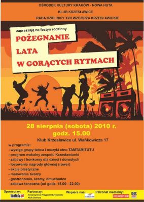 Klub Krzesławice Ośrodka Kultury Kraków-Nowa Huta oraz Rada Dzielnicy XVII Wzgórza Krzesławickie zapraszają na festyn rodzinny Pożegnanie lata w gorących rytmach.