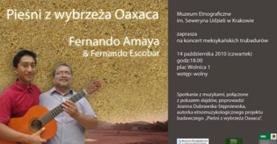 W najbliższy czwartek, 14. października 2010 roku, o godz. 18.00, Muzeum Etnograficzne w Krakowie zaprasza do Ratusza, na koncert trubadurów z południowego Meksyku, połączony z pokazem slajdów. Muzycy, ojciec i syn, Fernando Amaya i Fernando Escobar goszczą w Polsce w ramach etnomuzykologicznego projektu badawczego „Pieśni z wybrzeża Oaxaca". Spotkanie poprowadzi Joanna Dubrawska-Stępniewska, absolwentka dziennikarstwa i muzykologii na Uniwersytecie Warszawskim, autorka projektu.