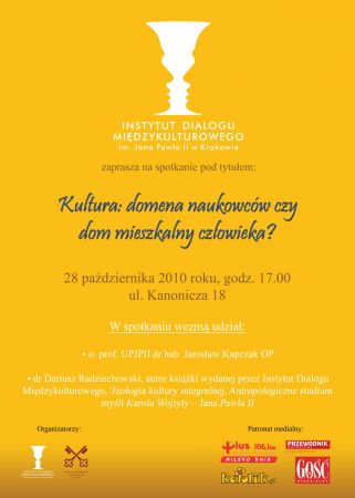 Odbędzie się ono 28. października 2010 o godzinie 17:00, w siedzibie Instytutu przy ulicy Kanoniczej 18. Temat naszej dyskusji nawiązuje do przemówienia Jana Pawła II w Leuven w 1985 r. W spotkaniu weźmie udział o. prof. UPJPII dr hab. Jarosław Kupczak OP wraz z autorem książki wydanej przez Instytut Dialogu Międzykulturowego, Teologia kultury integralnej. Antropologiczne studium myśli Karola Wojtyły – Jana Pawła II, Panem dr Dariuszem Radziechowskim. Książka podejmuje całościową analizę teologii kultury w oparciu o myśl i nauczanie Karola Wojtyły – Jana Pawła II. Wskazuje na antropologiczne podstawy adekwatnej dyskusji o kulturze, ukazując człowieka jako tego, który żyje kulturą i żyje poprzez kulturę zarówno w wymiarze indywidualnym, jak i wspólnotowym. Człowieka, który ma możliwość tworzenia nie tylko piękna dzieł zewnętrznych, ale i piękna własnej duszy. Książka stara się także ukazać adekwatną relację kultury i religii, oraz wskazuje na stan współczesnej kultury, jej kryzys, a zarazem możliwe kierunki rozwoju.