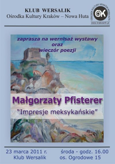 Zapraszamy na wernisaż wystawy i wieczór poezji Małgorzaty Pfisterer, który odbędzie się w Klubie Wersalik Ośrodka Kultury Kraków-Nowa Huta. Małgorzaty Pfisterer - pedagog, artystka malarka, rodowita krakowianką. Swoje prace, wykonywane różnymi technikami, wystawia w Polsce i za granicą. Część z nich znajduje się w zbiorach prywatnych w Austrii, Ameryce, Afryce, we Włoszech, a nawet w Indonezji. Uczestniczy w licznych plenerach i warsztatach, tak krajowych, jak i zagranicznych.