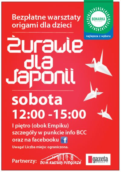 W Japonii wierzy się, że jeśli chcemy, by ktoś wyzdrowiał lub, by spełniło się czyjeś marzenie trzeba w tej intencji złożyć własnoręcznie żurawia z papieru -mówi Mariola Rogóż, Dyrektor Marketingu i Najmu Bonarka City Center. Z tego powodu, sobotnie warsztaty dla dzieci poświęcimy kulturze Japonii i sztuce origami. Dzieci, które do nas przyjdą poznają symbolikę papierowych form i wspólnie złożymy żurawie, by symbolicznie wsparły poszkodowane przez tsunami japońskie miasto Kesennuma - dodaje Mariola Rogóż. Żurawie zostaną przekazane Muzeum Sztuki i Techniki Japońskiej Mangha, które przekaże papierowe symbole szczęścia do Kesennumy – miasta zaprzyjaźnionego z Krakowem.