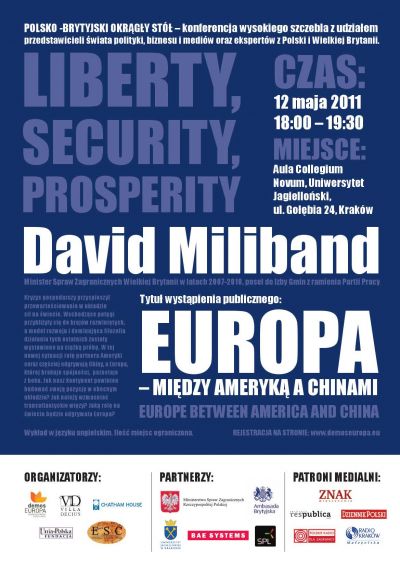 Centrum Strategii Europejskiej – demosEuropa wspólnie z Fundacją Unia&Polska, brytyjskim Chatham House, Uniwersytetem w Oxfordzie i Stowarzyszeniem Willa Decjusza zapraszają 12 maja, o godz. 18.00 do Auli Collegium Novum Uniwersytetu Jagiellońskiego (Kraków, ul. Gołębia 24) na wystąpienie Davida Milibanda, Ministra Spraw Zagranicznych Wielkiej Brytanii w latach 2007 -2010. Wykład pt. Europa – między Ameryką a Chinami i późniejsza debata prowadzona przez Krzysztofa Bobińskiego otworzą czwartą edycję dorocznej konferencji Polsko-Brytyjski Okrągły Stół.
