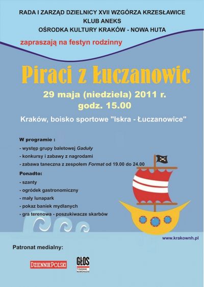 Klub Aneks Ośrodka Kultury Kraków – Nowa Huta oraz Rada i Zarząd Dzielnicy XVII Wzgórza Krzesławickie zapraszają na imprezę plenerową o tematyce pirackiej z okazji Dnia Łuczanowic.