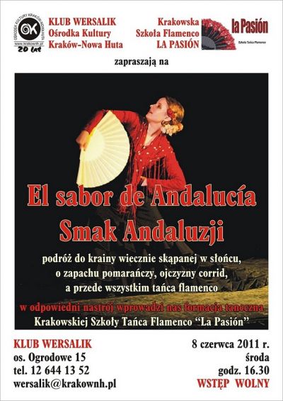 Klub Wersalik Ośrodka Kultury Kraków - Nowa Huta (os. Ogrodowe 15) i Krakowska Szkoła Flamenco La Pasión zapraszają 8 czerwca 2011 r. o godz. 16.30 do wspólnej podróży do Andaluzji, krainy wiecznie skąpej w słońcu i zapachu pomarańczy, ojczyzny corrid, a przede wszystkim tańca flamenco.