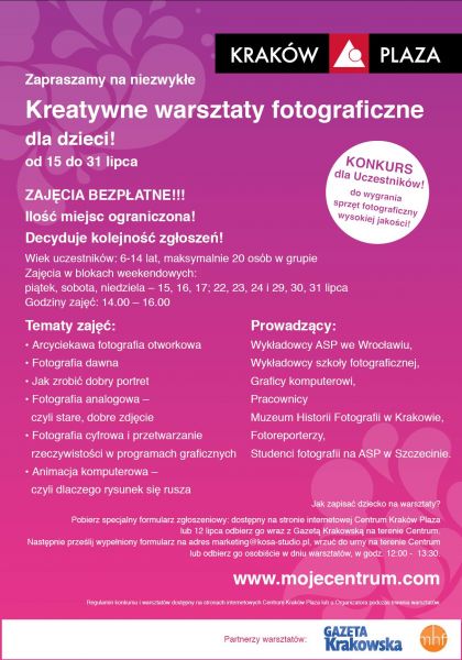Dzieci nie musza nudzić się w oczekiwaniu na wakacyjny wyjazd, mogą ten czas spędzić na niezwykle atrakcyjnych warsztatach fotograficznych w Kraków Plaza. W trzy lipcowe weekendy 15-17 lipca, 22-24 lipca i 29-31 lipca, w godzinach 14:00 – 16:00, będą miały okazję zgłębić tajniki fotografii i animacji komputerowej pod okiem ekspertów. Nabyte umiejętności dzieci będą mogły wykorzystać biorąc udział w konkursie dla uczestników pt. „Rodzina na wakacjach”. Zwycięzcy otrzymają atrakcyjne nagrody w postaci wysokiej jakości sprzętu fotograficznego a ich prace zostaną opublikowane w Gazecie Krakowskiej.