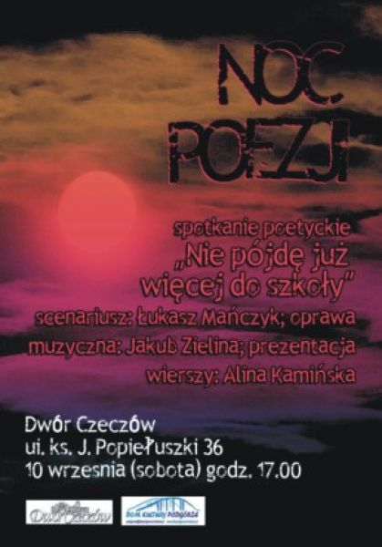 Zapraszamy na "Noc poezji", w ramach której odbędzie się spotkanie poetyckie „Nie pójdę już więcej do szkoły” – wiersze o szkole począwszy od klasyków, a skończywszy na cytowanym w tytule singlu Republiki oraz utworach Pink Floyd z „The Wall”.