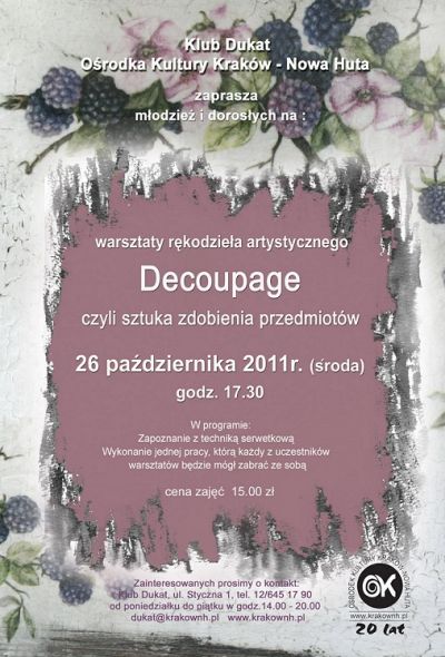 Zajęcia odbędą się 26 października (środa) 2011 r. w godz. 17.30 – 19.00 i poświęcone będą technice decoupage - czyli sztuce zdobienia przedmiotów.