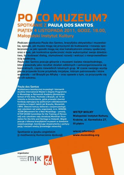 Paula dos Santos pracuje głównie z muzeami świata niezachodniego, które powstały jako rezultat inicjatyw oddolnych i samoorganizowania się konkretnych, często niewielkich lokalnych grup. W czasie swojego wystąpienia przywoła liczne przykłady inicjatyw, którym patronowała i które wspierała – od Brazylii po Afrykę – oraz opowie o tym, co przyczyniło się do ich sukcesu.