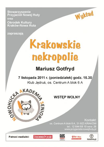 Stowarzyszenie Przyjaciół Nowej Huty i Ośrodek Kultury Kraków-Nowa Huta zapraszają na kolejny wykład w ramach Nowohuckiej Akademii Seniora. Tematyka spotkania dotyczyć będzie historii krakowskich cmentarzy, zwyczajów pogrzebowych i różnych form pochówków. Usłyszymy także opowieści o miastach umarłych w Krakowie.