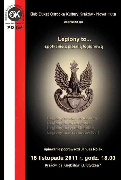 Klub Dukat Ośrodka Kultury Kraków-Nowa Huta (ul. Styczna 1) już po raz drugi zaprasza na wspólne śpiewanie piosenek i pieśni niepodległościowych, które odbędzie się 16 listopada (środa) 2011 r. o godz. 18.00