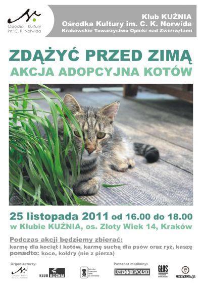 Klub KUŹNIA Ośrodka Kultury im. C. K. Norwida oraz Krakowskie Towarzystwo Opieki nad Zwierzętami zapraszają na AKCJĘ ADOPCYJNĄ KOTÓW – ZDĄRZYĆ PRZED ZIMĄ. Podczas akcji odbędzie się zbiórka karmy dla kotów, karmy suchej dla psów, kaszy, ryżu oraz koców i kołder (nie z pierza) dla podopiecznych schroniska dla bezdomnych zwierząt przy ul Rybnej. Wszystkie koty przeznaczone do adopcji posiadają książeczki zdrowia i aktualne szczepienia. Każdy, kto przyjdzie adoptować kotka musi mieć ze sobą przenoskę lub koszyk, w którym zabierze kotka do domu.