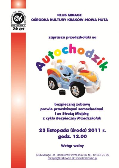 Klub Mirage Ośrodka Kultury Kraków-Nowa Huta (os. Bohaterów Września 26) zaprasza 23 listopada (środa) 2011 r. o godz. 12.00 na cykliczną imprezę prowadzoną przez Jacka Gronowskiego ze Straży Miejskiej Miasta Krakowa poświęconą bezpieczeństwu najmłodszych.