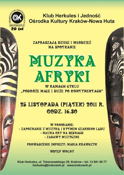 Klub Herkules Ośrodka Kultury Kraków-Nowa Huta (ul. Tokarzewskiego 29) zaprasza 25 listopada (piątek) 2011 r. o godz. 16.30 na kolejne spotkanie w ramach projektu Podróże małe i duże po kontynentach poświęcone Muzyce Afryki.