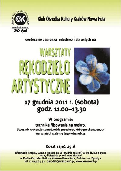 Klub Ośrodka Kultury Kraków-Nowa Huta (os. Zgody 1) zaprasza 17 grudnia (sobota) 2011 r. w godz. 11.00 – 13.30 na kolejne warsztaty rękodzielnicze. Podczas zajęć uczestnicy zapoznają się z techniką filcowania na mokro. W programie będzie wykonanie obrazka.