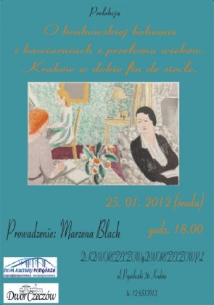 Dwór Czeczów zaprasza na kolejne spotkanie z histroią Krakowa. Tym razem bedzie to prelekcja Marzeny Błach pt."O krakowskiej bohemie i kawiarniach z przełomu wieków. Kraków w dobie fin de siecle".
