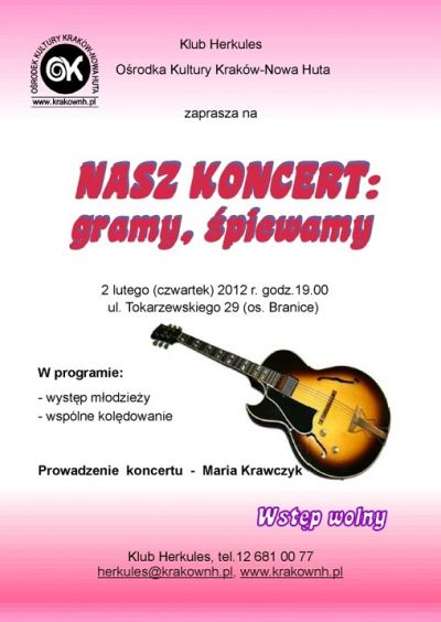 Zapraszamy na wspólne kolędowanie podczas występu dzieci i młodzieży uczestniczących w zajęciach gry na gitarze w Klubie Herkules Ośrodka Kultury Kraków-Nowa Huta. Koncert poprowadzi instruktorka nauki gry na gitarze p. Maria Krawczyk. W repertuarze młodych artystów znajdą się znane kolędy i pastorałki.