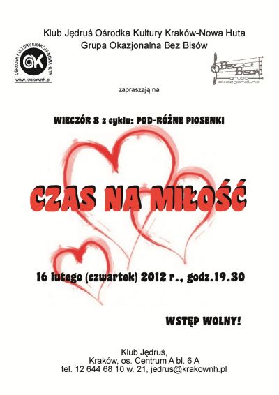 Klub Jędruś Ośrodka Kultury Kraków-Nowa Huta (os. Centrum A 6a) zaprasza na ósmy wieczór z cyklu POD – RÓŻNE PIOSENKI.