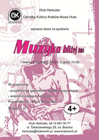 Klub Herkules Ośrodka Kultury Kraków-Nowa Huta (ul. Tokarzewskiego 29) zaprasza 1 marca (czwartek) 2012 r. o godz. 10.00 na kolejne spotkanie muzyczne prowadzone w formie zabawy, mające na celu przybliżenie dzieciom gatunków i stylów muzycznych, jak również technik kompozytorskich.