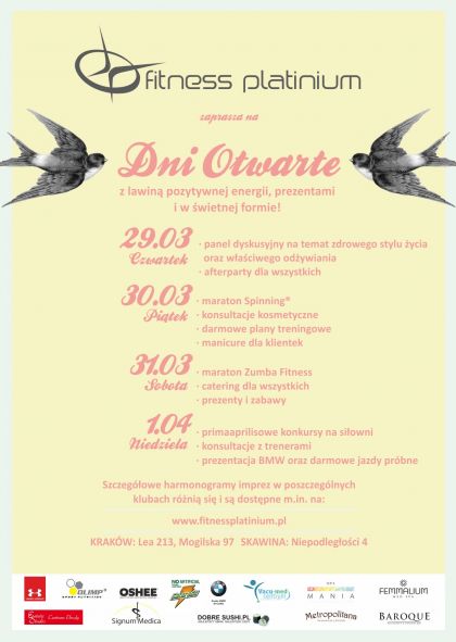 Jeszcze nie opuścił Cię zimowy marazm? A Twoje kości źle znoszą nawet najkrótszy spacer? Czas na wiosenny rozruch! W dniach 30, 31 marca oraz 1 kwietnia Platinium Fitness zorganizuje specjalnie dla Was Dni Otwarte w swoich siedzibach przy Mogilskiej, Lea i Niepodległości w Skawinie.