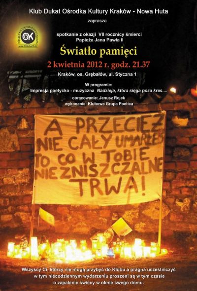 Już po raz siódmy Klub Dukat Ośrodka Kultury Kraków-Nowa Huta (ul. Styczna 1) zaprasza na niezwykłe spotkanie wszystkich, którzy chcą poprzez swoją obecność i zapalenie Światła Pamięci, dać zewnętrzny wyraz łączności duchowej z Ojcem Świętym.
