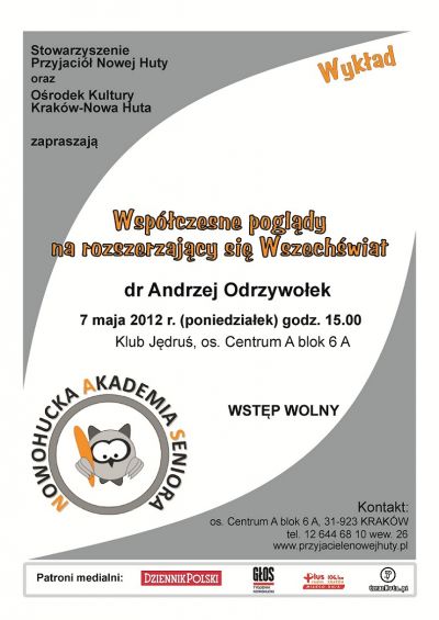 Wykład odbędzie się 7 maja 2012 r. (poniedziałek) o godz. 15.00 w Klubie Jędruś Ośrodka Kultury Kraków-Nowa Huta (os. Centrum A 6a).