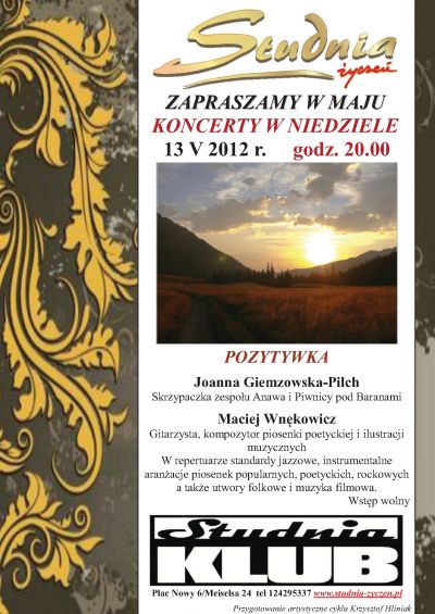 Skrzypaczka zespołu Anawa i Piwnicy pod Baranami oraz gitarzysta, kompozytor piosenki poetyckiej wykonają standardy jazzowe, instrumentalne aranżacje piosenek popularnych, poetyckich, rockowych a także utwory folkowe i muzykę filmową.