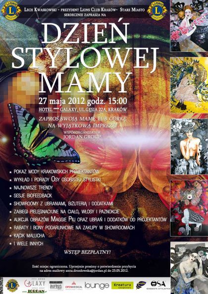 Podczas imprezy przewidywany jest wykład p. Moniki Jurczyk – OSY osobistej stylistki na temat dopasowania ubioru do sylwetki i stylu życia oraz wykład trenera z Centrum Terapii i Rozwoju Open Medical o nowej metodzie biofeedback stosowanej w psychologii i medycynie. Odbędzie się również pokaz mody zorganizowany przez krakowskich projektantów. Ponadto goście będą mogli zakupić ubrania i dodatki w specjalnie przygotowanych showroomach korzystając z porad stylistek, które towarzyszyć im będą przez cały czas trwania imprezy. Fryzjerzy i gabinety SPA będą informować uczestników o najnowszych trendach i sposobach dbania o ciało. Przez cały czas trwania eventu podziwiać będzie można obrazy p. Małgorzaty Bieniek maggie piu.