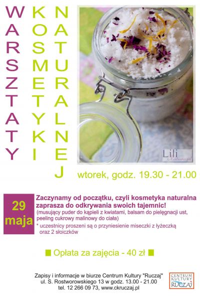 Chcesz dowiedzieć się czym jest aromaterapia? Co kryje się w konwencjonalnych kosmetykach? Co to są kosmetyki ekologiczne i jak je odróżnić? Co doskonale sprawdzi się w pielęgnacji Twojego ciała? Przyjdź na warsztaty kosmetyki naturalnej!