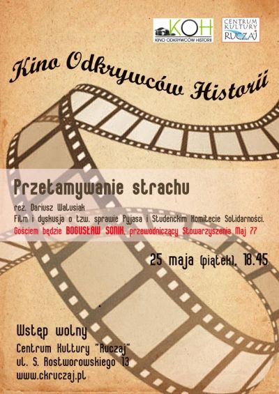 Centrum Kultury "Ruczaj" zaprasza na projekcję filmu "Przełamywanie strachu" i dyskusję o tzw. sprawie Pyjasa i Studenckim Komitecie Solidarności. Gościem będzie Bogusław Sonik, przewodniczący Stowarzyszenia Maj 77.