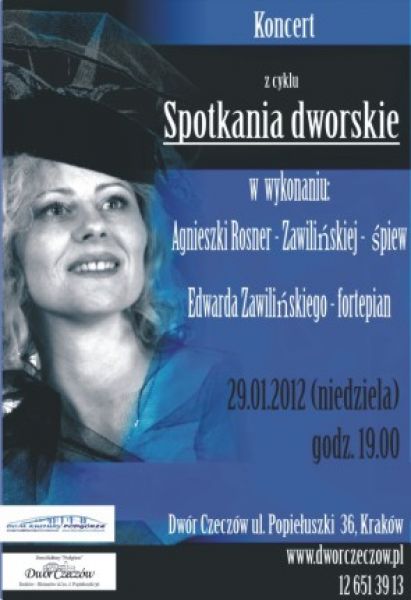 Od lirycznych kawałków po drapieżne melodie z paryskich scen. O tęsknocie, nadziei i miłości zaśpiewa podczas "Spotkań Dworskich" Agnieszka Rösner-Zawilińska, artystka kabaretu Loch Camelot, laureatka III Ogólnopolskiego Festiwalu Piosenki Kabaretowej O.B.O.R.A. w Poznaniu, nagradzana wielokrotnie przez publiczność. W repertuarze znajdą się aranżacje tekstów między innymi Bolesława Leśmiana, Wisławy Szymborskiej, Juliana Tuwima, Adama Ziemianina i Edith Piaf.