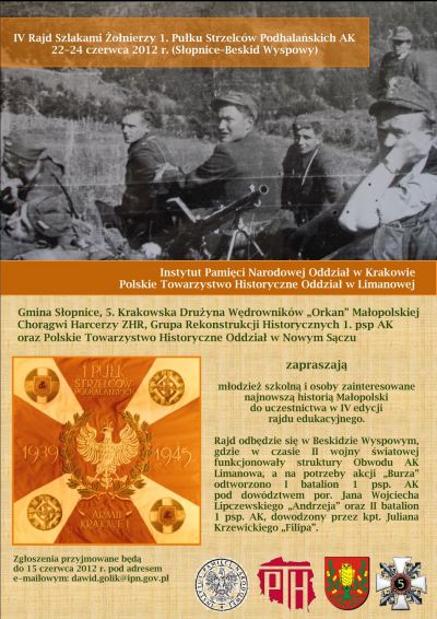 W dniach 22–24 czerwca 2012 r. odbędzie się IV edycja rajdu edukacyjnego „Szlakami Żołnierzy 1. Pułku Strzelców Podhalańskich AK”. Głównymi organizatorami rajdu są Instytut Pamięci Narodowej Oddział w Krakowie oraz Polskie Towarzystwo Historyczne Oddział w Limanowej. W organizację rajdu włączyła się również Gmina Słopnice, Małopolska Chorągiew Harcerzy ZHR (5. KDW „Orkan”), Grupa Rekonstrukcji Historycznych 1. psp AK oraz Polskie Towarzystwo Historyczne Oddział w Nowym Sączu.