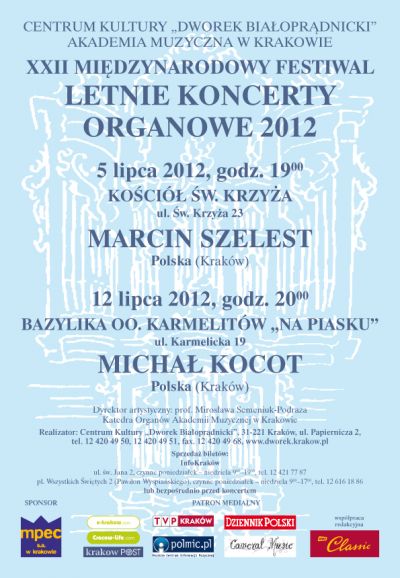 Centrum Kultury „Dworek Białoprądnicki” we współpracy z Akademią Muzyczną w Krakowie zaprasza na XXII Międzynarodowy Festiwal „Letnie Koncerty Organowe”. Koncerty odbywać się będą od 5 lipca do 9 sierpnia 2012 roku w każdy czwartek we wnętrzach najpiękniejszych krakowskich świątyń. Dyrektorem Artystycznym festiwalu jest prof. Mirosława Semeniuk-Podraza.
