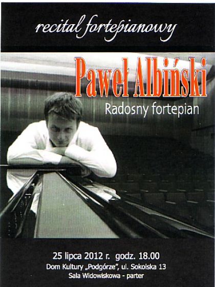 Recital fortepianowy na którym Paweł Albiński wykona swoje autorskie kompozycje oraz inne utwory fortepianowe z epoki romantyzmu i muzyki współczesnej. Wśród kompozytorów których usłyszymy znajdą się takie nazwiska jak Cziffra, Piazzola czy MacDowell.
