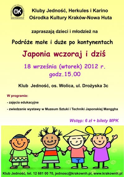 Klub Jedność Ośrodka Kultury Kraków-Nowa Huta (ul. Drożyska 3c) zaprasza na zajęcia Japonia wczoraj i dziś, które odbędą się 18 września 2012 r. (wtorek) o godz. 15.00.