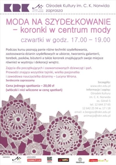 Podczas kursu poznają panie różne techniki szydełkowania, zastosowania dzianin szydełkowych w ubiorze, tworzeniu galanterii, torebek, pasków, biżuterii a także koronek znajdujących swoje miejsce również w wystroju i dekoracji wnętrz.
