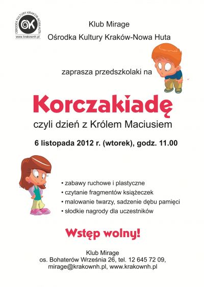 Klub Mirage Ośrodka Kultury Kraków-Nowa Huta (os. Bohaterów Września 26) zaprasza 6 listopada 2012 r. (wtorek) o godz. 11.00 na imprezę dla przedszkolaków organizowaną z okazji obchodów roku Janusza Korczaka.