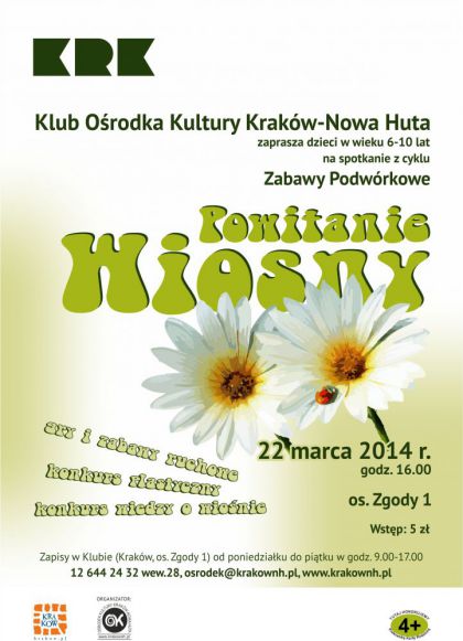 Klub Orodka Kultury Krakw-Nowa Huta (os. Zgody 1) zaprasza dzieci na imprez z okazji nadejcia wiosny. Termin 22 marca, godz. 16.00.
