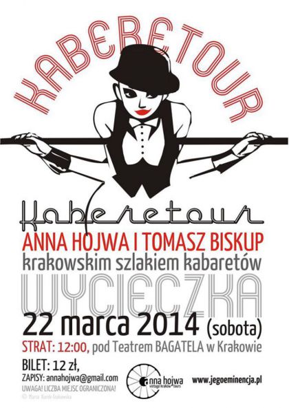 Duet zoony z przewodniczki i kabareciarza zabierze Was w wiat dawnego kabaretu, dosownie i w przenoni. Anna Hojwa (Vintage Tours) oprowadzi po lokalach i opowie o ludziach, natomiast Tomek Biskup urozmaici wycieczk monologami zaczerpnitymi z twrczoci dawnych mistrzw komedii.